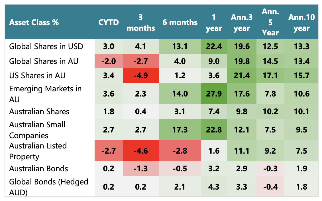 Australian bond returns were below cash due to rising yields, although global bonds exceeded the cash rate of 3.6% over 1 year.